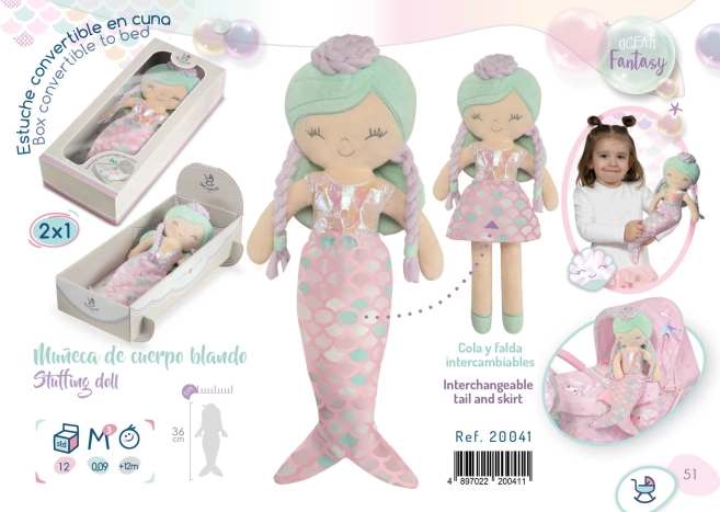 Păpușa de pluș Ocean Fantasy din colecția 2021 va încânta orice fetiță cu designul său spaniol uimitor. Vine cu un înveliș textil care reprezintă coada sirenei, permițând transformarea într-o fetiță. Acest set multifuncțional include și o cutie de cadou decorativă, care poate fi transformată într-un leagăn.