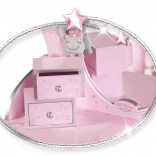 - Mânere stilizate pe sertare de culoare argintie și un mic cuier argintiu suspendat cu steluță.
