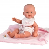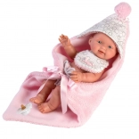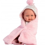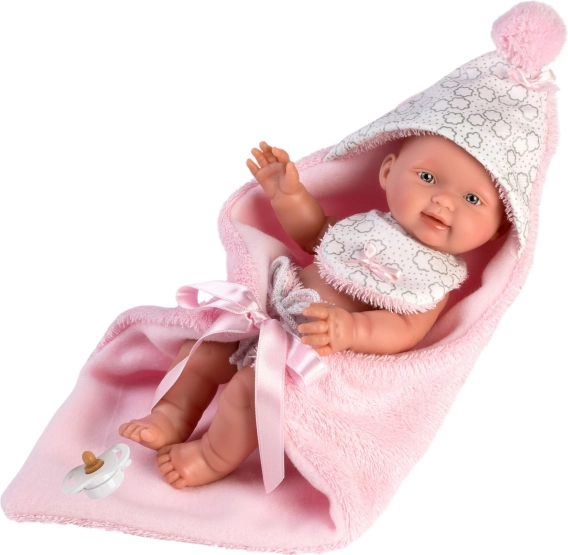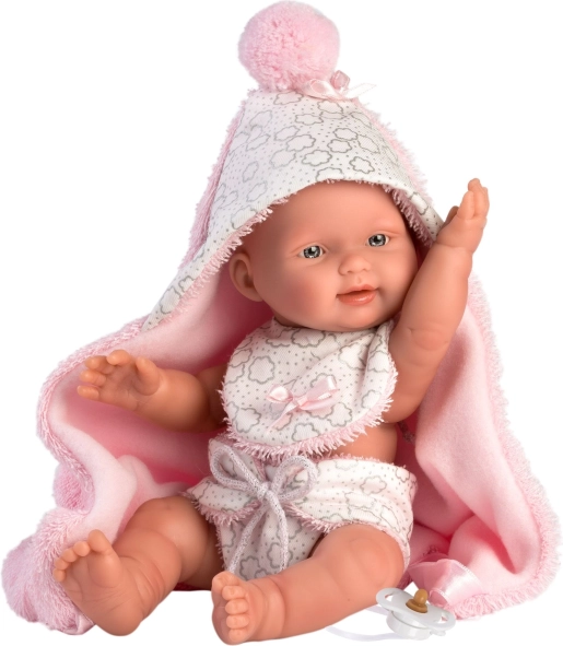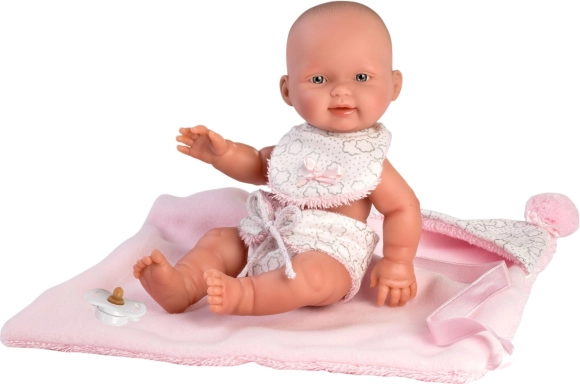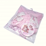 Acest costum cu două piese este special conceput pentru păpușa bebeluș Nou Născut cu o dimensiune de 26 cm. Include o pătură reversibilă cu glugă, care protejează păpușa și îi oferă aspectul unui bebeluș adevărat.