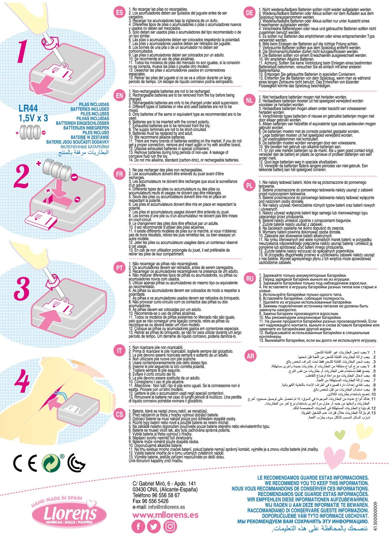 Păpușa este realizată manual în Spania, cu accent pe calitate și detalii. Este ambalată într-o elegantă cutie cadou, fiind ideală pentru oferit. Pentru păpușă se pot achiziționa separat haine originale din gama Llorens pentru mărimea de 33 cm. Bateriile sunt incluse, astfel încât păpușa este gata de joacă imediat după îndepărtarea siguranței.
