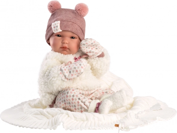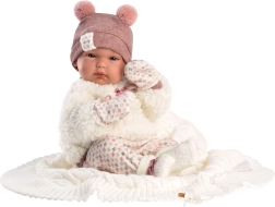 Păpușa este îmbrăcată stilat și include toate accesoriile necesare, inclusiv pulovere, căciulă, și suzetă decorativă.