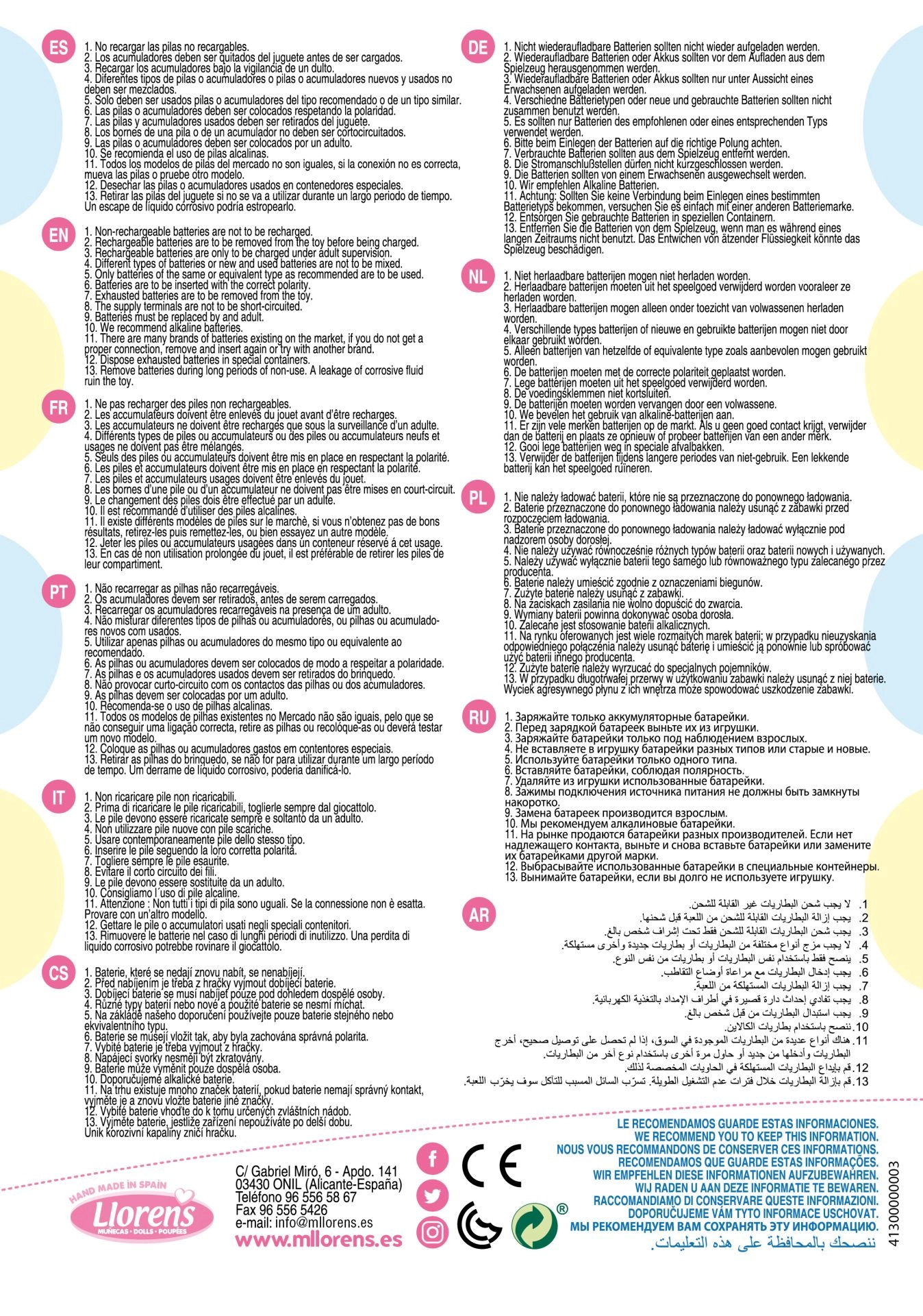 Pachetul include un suzetă accesoriu și 3× baterii tip buton LR44 (cu instrucțiuni de înlocuire). Păpușa este fabricată manual în Spania și este compatibilă cu îmbrăcămintea originală Llorens pentru bebelușii NEW BORN de 35–36 cm.