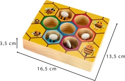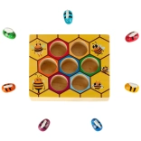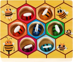 Joc educațional Fagure de albine Montessori sprijină dezvoltarea abilităților motorii și a independenței copiilor. Conține o bază din lemn masiv și șapte albine colorate, pe care copiii le așază în găuri corespunzătoare folosind penseta roșie din plastic.