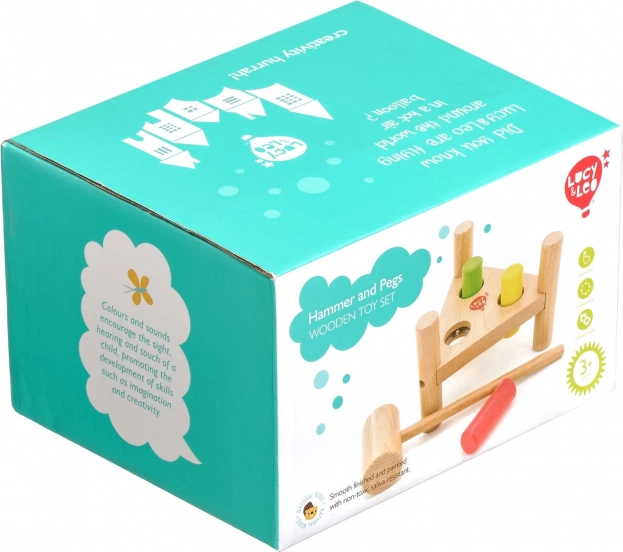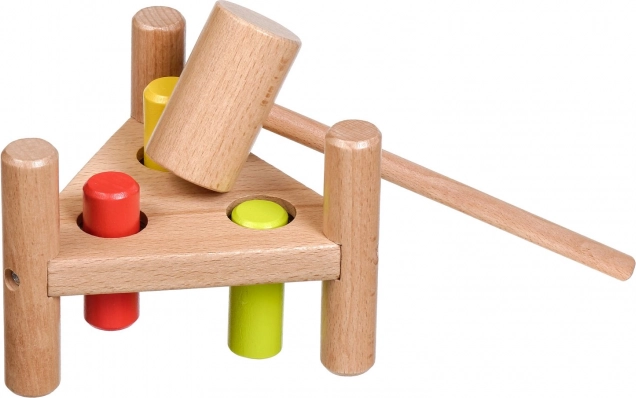 Baterea țărușilor colorați cu ciocănelul consolidează motricitatea fină, precizia prinderii și coordonarea mână–ochi la cei mici.