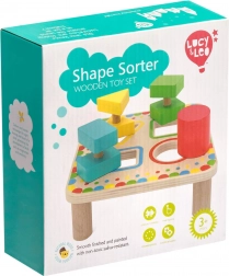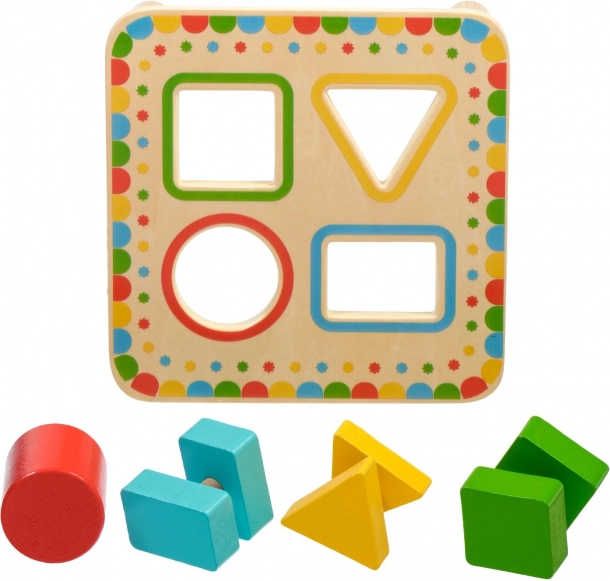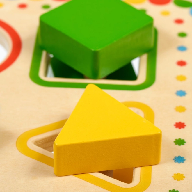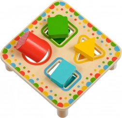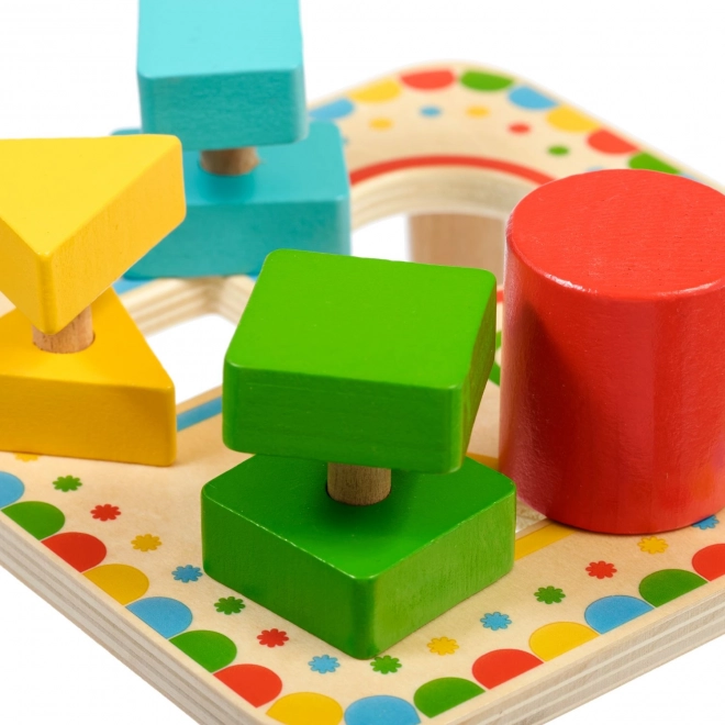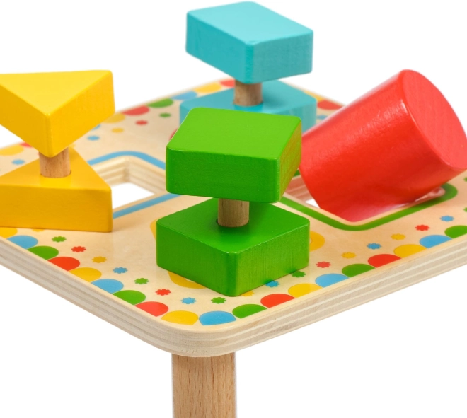 Placa, sprijinită pe picioare stabile, are patru orificii încadrate colorat, asortate cu culorile pieselor. Setul este ideal pentru jocul independent sau pentru descoperirea împreună cu părinții și este o excelentă jucărie educativă din lemn pentru preșcolari.