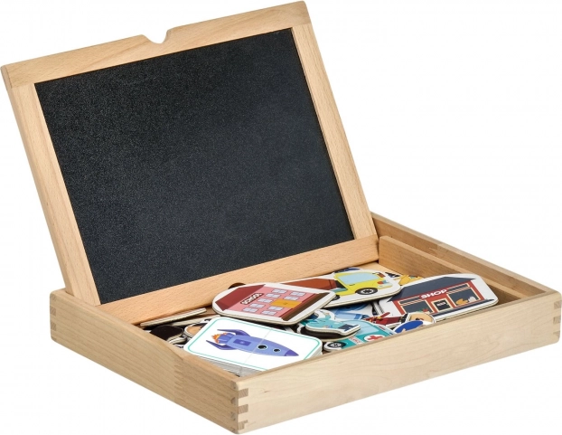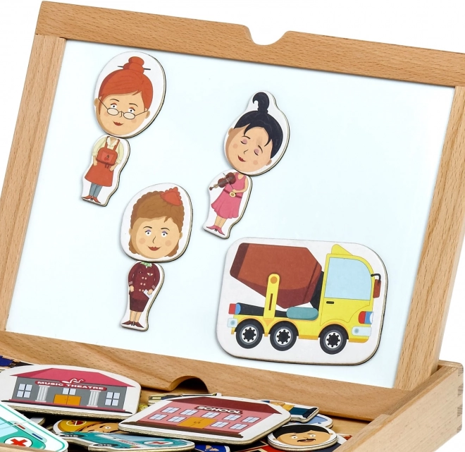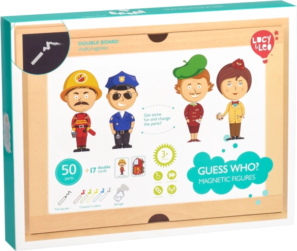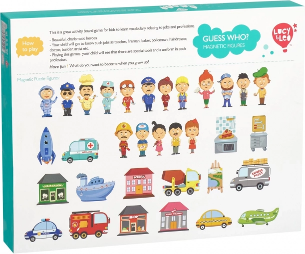 Acest set magnetic creativ le prezintă copiilor, într-un mod ludic, lumea profesiilor – de la pompier și polițist până la bucătar sau pilot. Datorită cardurilor față-verso, copiii pot alcătui combinațiile corecte sau pot crea propriile personaje și scenete. Practica valiză din lemn cu tablă magnetică asigură depozitarea comodă a tuturor pieselor și transportul facil în călătorii.
