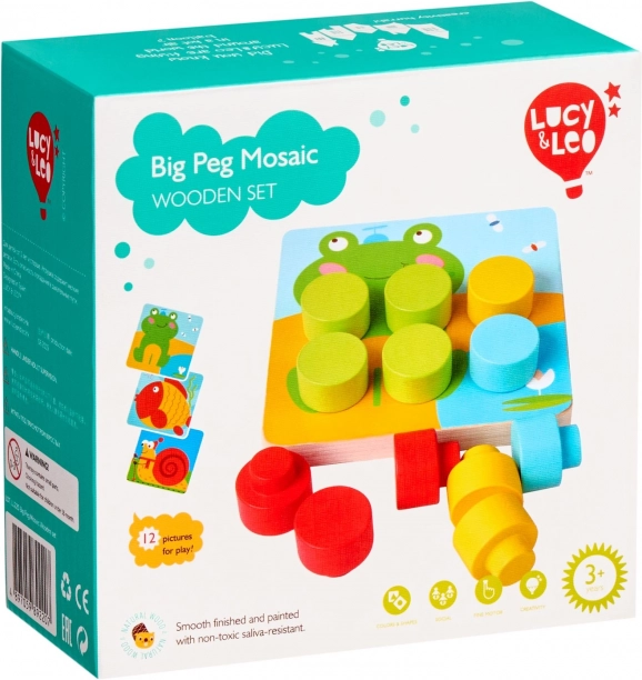 Acest mozaic educativ cu pini mari este o unealtă Montessori ideală pentru primele exerciții ale degețelelor și coordonarea mână–ochi. Copiii introduc pinii colorați în placa din lemn conform șabloanelor sau creează propriile modele, exersând astfel gândirea logică, răbdarea și percepția vizuală.