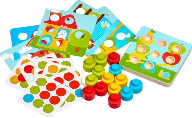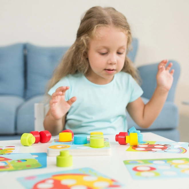 Pachetul oferă 12 șabloane față-verso: 6 imagini colorate perforate, care se așază pe suport, și 6 șabloane colorate pentru aranjarea modelelor direct pe placă. Datorită finisajului neted și culorilor vii, jocul este atractiv și sigur pentru copii. Suportul din lemn, cu dimensiunile 14 × 14 × 1,5 cm, este compact și ușor de transportat.