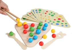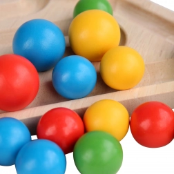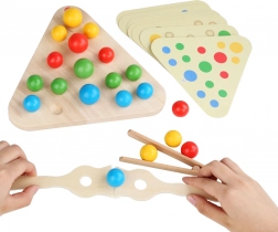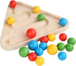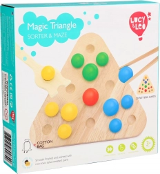 Descoperiți distracția creativă și învățarea într-un singur joc. Placa triunghiulară din lemn, cu două fețe, aduce două activități: sortarea bilelor colorate după 20 de modele folosind penseta și lingura incluse și un labirint dinamic, în care copiii își exersează răbdarea și precizia. Bilele colorate se păstrează după joacă în săculețul de in, astfel încât totul rămâne la un loc.