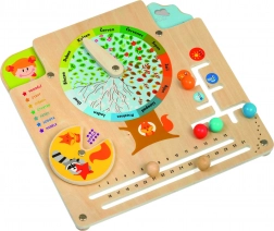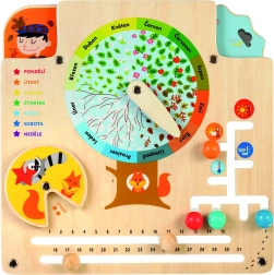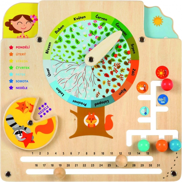 Calendarul naturii din lemn LUCY & LEO este un instrument ideal pentru învățarea prin joc. În centrul plăcii se află un pom fructifer cu frunze și un indicator pentru 12 luni, datorită căruia copiii asociază ușor iarna cu zăpada, primăvara cu florile, vara cu fructele și toamna cu frunzele căzătoare. Copiii învață, de asemenea, să recunoască zilele săptămânii, numărul de zile din lună, vremea, temperatura și îmbrăcămintea potrivită pentru diferite condiții.