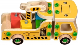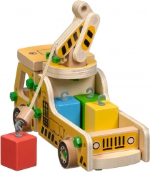 Pachetul include 16 piese din lemn pentru asamblarea macaralei, șuruburi, o șurubelniță și 4 blocuri colorate care reprezintă încărcătura. Această jucărie funcționează, de asemenea, ca un material Montessori, care ajută copilul să își dezvolte eficient abilități variate.