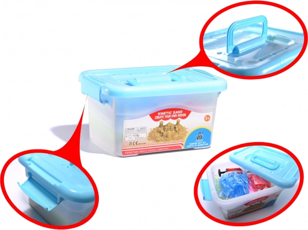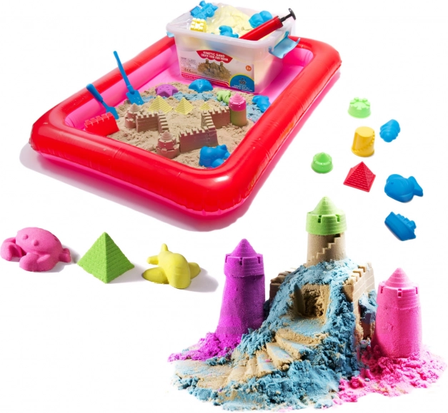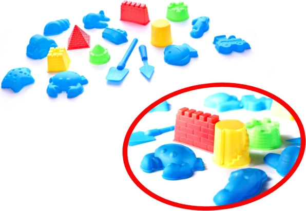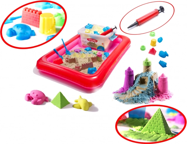 Setul de nisip pentru copii include 14 forme din plastic, greblă, sită, spatulă și pâlnie. Cu un astfel de kit, nu vă veți plictisi. Setul cu nisip cinetic include de asemenea, o groapă de nisip gonflabilă care vă permite să mențineți ordine în locul de joacă.