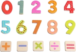 Setul include cifre din lemn viu colorate și semne matematice de bază. Copiii alcătuiesc ușor exerciții simple și învață să calculeze.