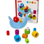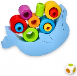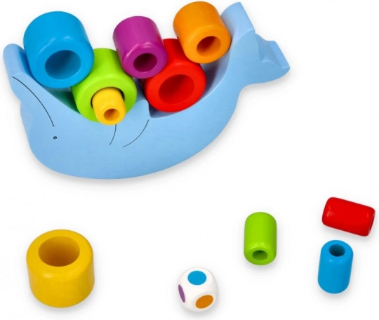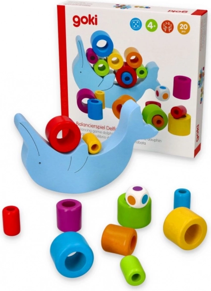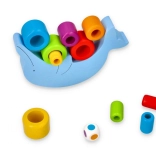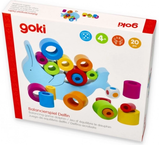 Setul conține un delfin din lemn de calitate și 18 inele colorate, care trebuie așezate strategic. Zarul inclus adaugă un plus de dificultate și distracție stabilind ordinea în care se așază inelele.