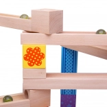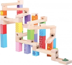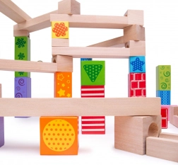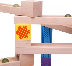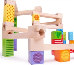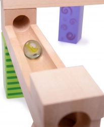 Acesta pistă de bile din lemn este ideal pentru copiii creativi care adoră să își construiască propriile trasee. Include 53 de piese care permit multe variații și designuri, bazate pe imaginația copiilor.