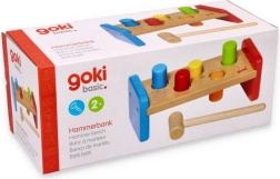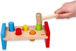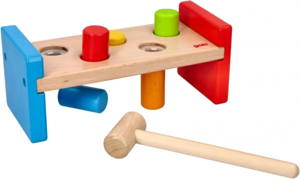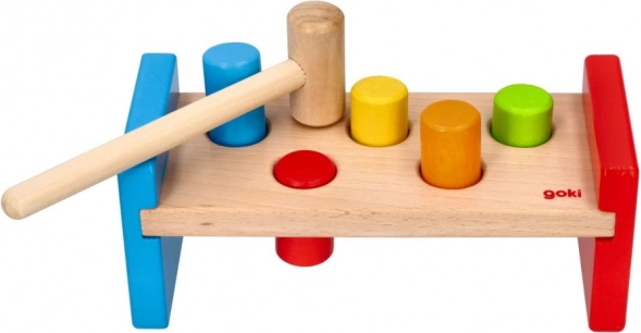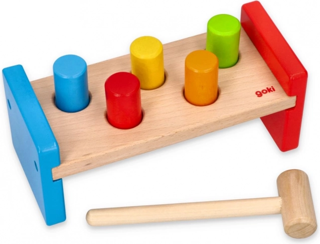 Acest banc de bătut robust este realizat din lemn durabil, finisat neted, cu vopsele sigure și netoxice. Copiii pot exersa priza, forța loviturii și răbdarea folosind ciocănelul din lemn, în timp ce țărușii colorați invită la joacă repetată.