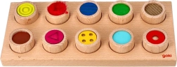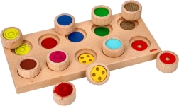 Acest joc senzorial din lemn, de înaltă calitate, îmbină distracția cu învățarea. Zece mini-cilindri cu suprafețe diferite sunt întorși cu fața în jos, amestecați, iar copiii, doar prin atingere, află unde se potrivește fiecare. O resursă excelentă pentru dezvoltarea senzomotricității, a concentrării și a răbdării, potrivită și pentru persoane cu deficiențe de vedere.