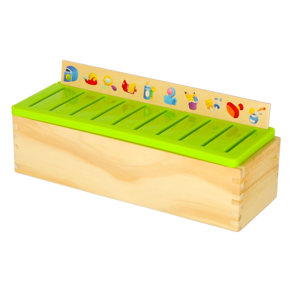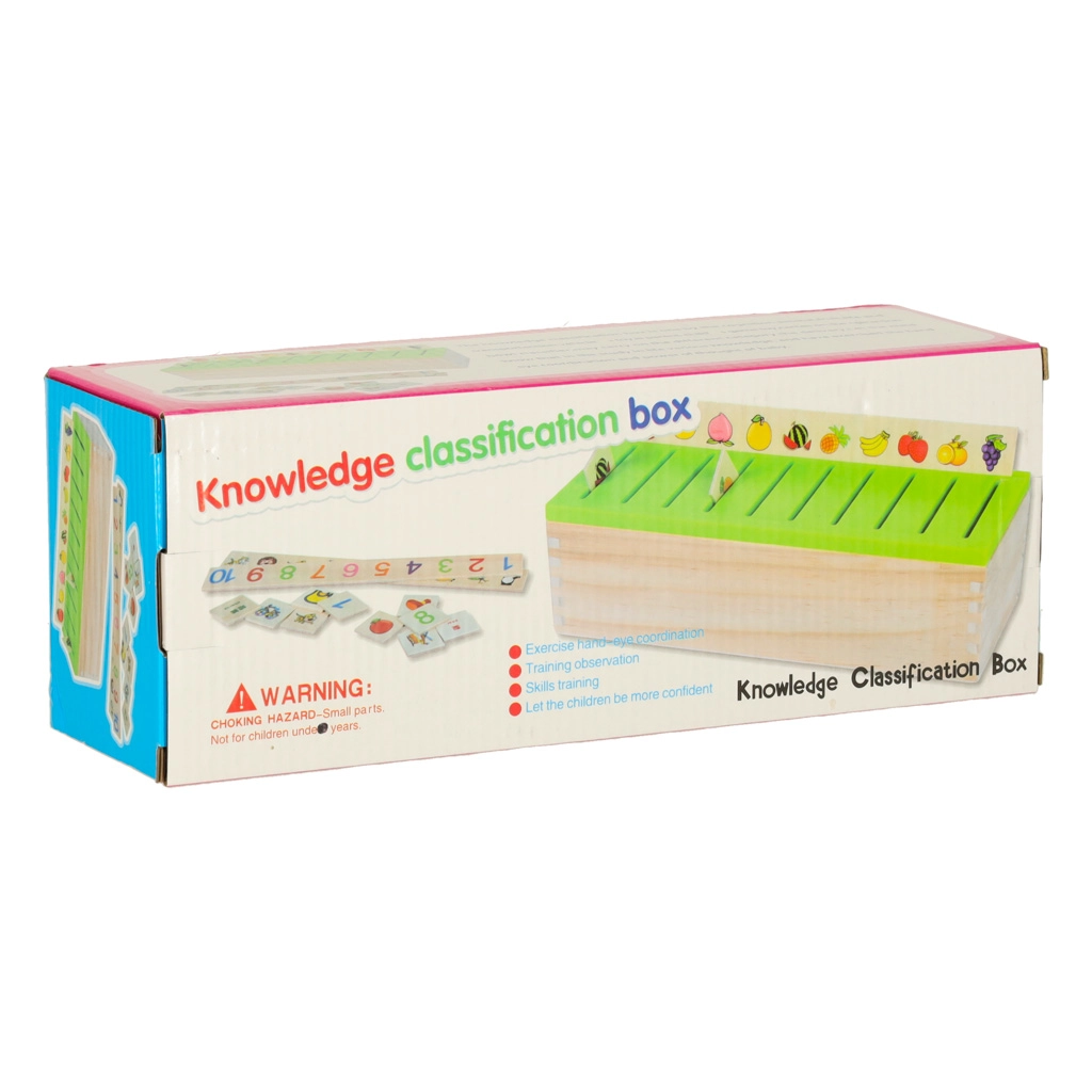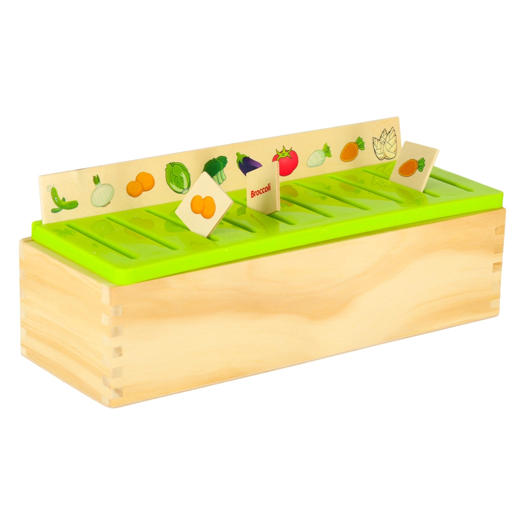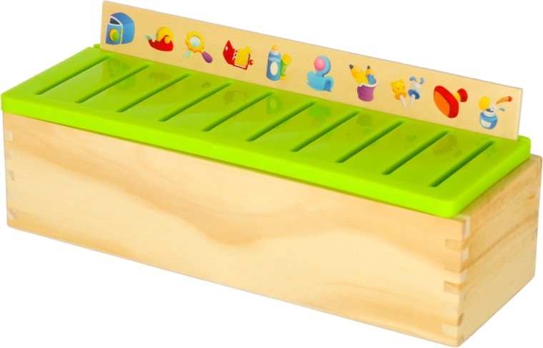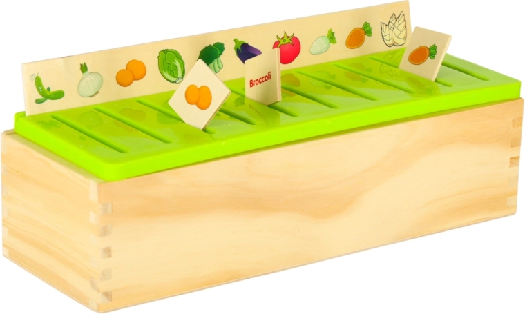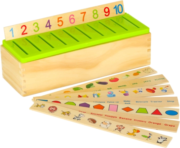 Sorterul educațional este o cutie din lemn bine gândită, cu capac verde ventilat, și un set de plăci tematice mari (numere, forme, animale, fructe și legume, mijloace de transport etc.). Copiii asociază cardurile mici din lemn, cu ilustrații colorate și termeni în engleză, cu imaginile corespunzătoare de pe placă și le introduc în slotul corect. Astfel își exersează observarea, memoria, concentrarea și își construiesc vocabularul.