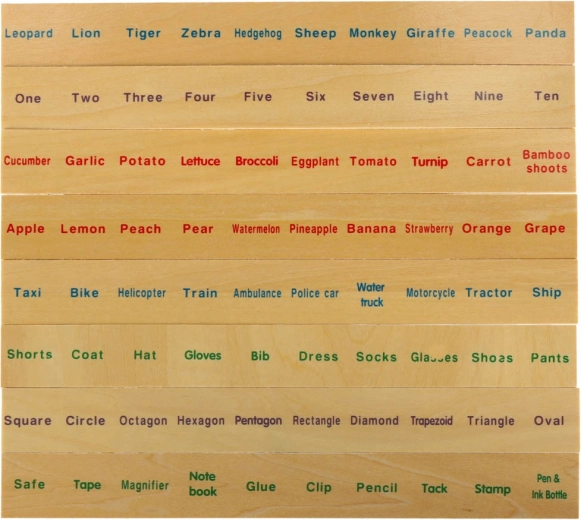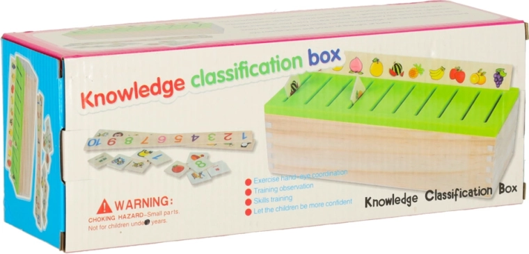 Jucărie inteligentă din lemn pentru preșcolari, care îmbină învățarea prin joc. Copiii sortează carduri mici cu imagini și cuvinte în limba engleză în sloturile corecte, după plăci tematice mari. Dezvoltă gândirea logică, motricitatea fină, recunoașterea formelor și categoriilor și bazele limbii engleze. Cutia robustă din lemn, cu capac detașabil rezistent, asigură ordine și durabilitate îndelungată.