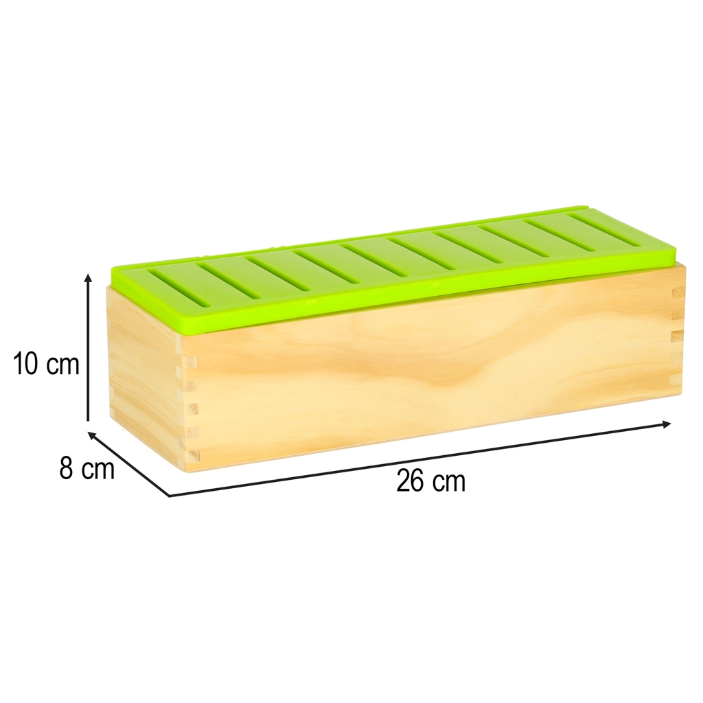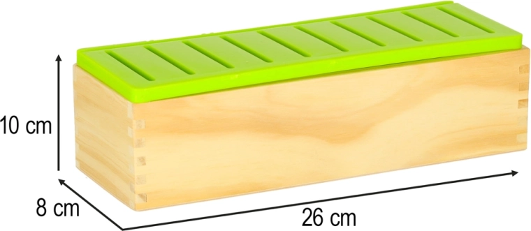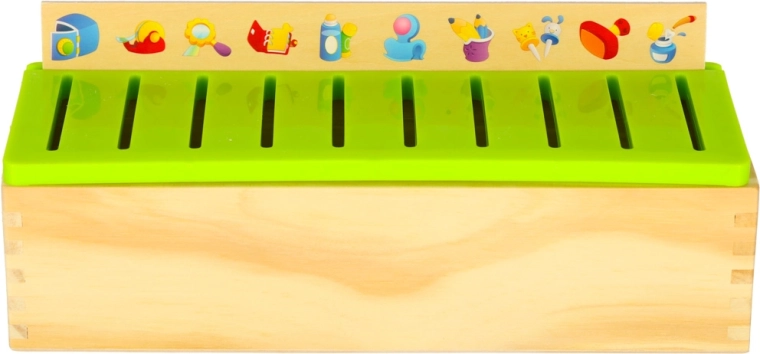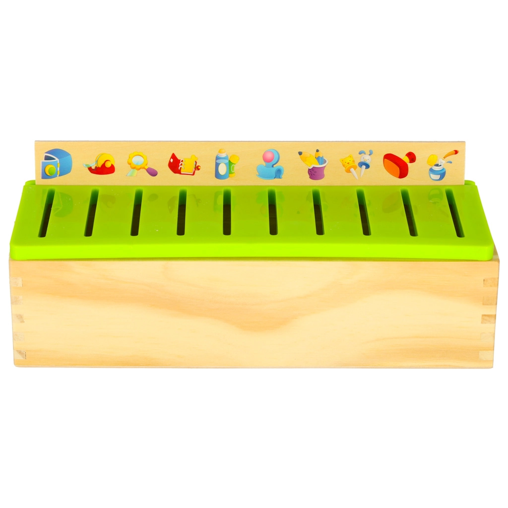 Lemn solid, muchii fin șlefuite și capac din plastic detașabil, prevăzut cu fante pentru introducere ușoară și curățare simplă. Ideală pentru joaca zilnică.