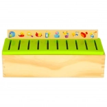 Descoperă jocul didactic din lemn, distractiv pentru cei mici, care îmbină joaca și învățarea. Copiii introduc plăcuțe mici cu imagini în fantele corecte, conform modelelor de pe riglele mari. Susține gândirea logică, motricitatea fină, recunoașterea formelor și imaginilor și primele noțiuni de engleză datorită etichetelor de pe carduri.