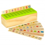 Execuția sigură, cu margini fin șlefuite și o cutie din lemn robustă, cu capac din plastic aerisit, asigură durabilitate îndelungată și depozitarea comodă a tuturor pieselor. Setul este ideal pentru învățare acasă și pentru grădinițe.