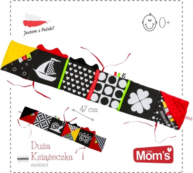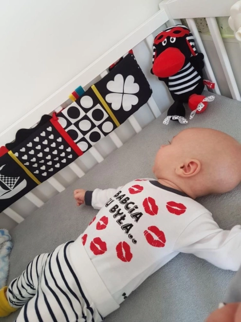 Descoperă o distracție delicată și stimulantă pentru cei mai mici. Această cărticică senzorială pentru pătuț combină culori contrastante (negru, alb, roșu), texturi diferite și elemente foșnitoare pentru a stimula văzul, simțul tactil și auzul. Datorită șnururilor de fixare, o poți prinde cu ușurință de pătuț sau cărucior, unde funcționează totodată ca protecție moale împotriva loviturilor. Fabricată din materiale sigure cu certificare OEKO-TEX și conformă CE.