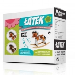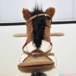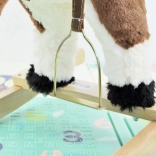 Căluțul include șa cu scărițe și zăbală, permițând copiilor să se apropie de senzația echitației reale.
