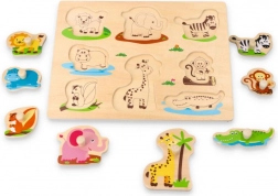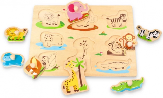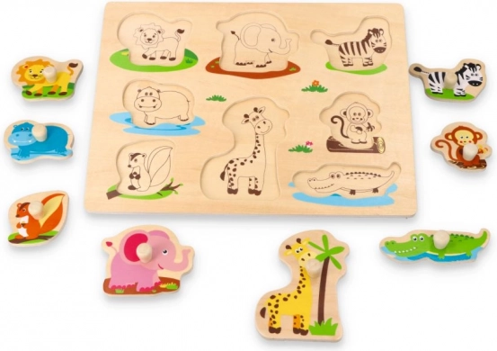 Placă puzzle din lemn Jungle este ideală pentru dezvoltarea abilităților motorii și recunoașterea formelor la copii. Personajele colorate de animale de pe placă oferă o experiență educativă și distractivă.