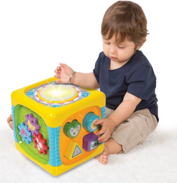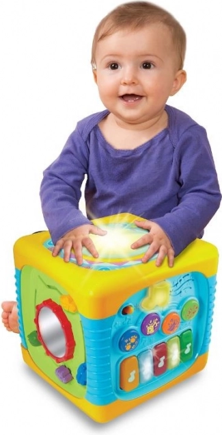 Fiecare latură oferă o altă activitate: pian cu tonuri și melodii, tobă care își schimbă culorile la lovire, sortator de forme cu piese mari, roți dințate colorate, animăluțe glisante și oglindă pentru descoperirea propriei reflecții. Cubul este fabricat din materiale de calitate, sigure, și este potrivit de la 8 luni.