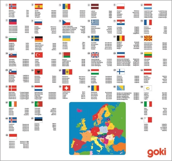 Puzzle-ul din lemn Harta Europei de la Goki este o jucărie educativă ideală pentru copii și școlari. Piesele în forma diferitelor țări se așază într-o placă robustă din lemn cu decupaje frezate, ceea ce facilitează manipularea și susține poziționarea corectă. Fiecare țară este marcată cu un număr, iar în legendă găsiți denumirea, capitala și steagul ei.