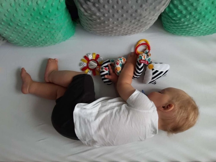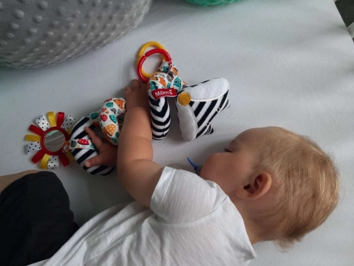 Oglinda moale, inelele colorate și sunetele blânde ale zornăitorii dezvoltă simțul tactil, auzul și coordonarea mână–ochi.