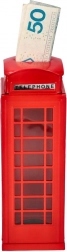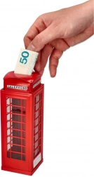 Această pușculiță folosește designul iconic al cabinei telefonice britanice, făcând-o un element decorativ atractiv.