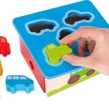 Această cutie de sortare GOKI din lemn de calitate, cu capac rabatabil și decupaje în formă de vehicule, este un instrument ideal pentru primele descoperiri ale formelor. Copiii învață într-un mod distractiv să recunoască formele și culorile, își dezvoltă coordonarea mână–ochi și exersează motricitatea fină a degetelor.