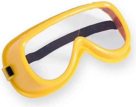Ochelari galbeni cu lentile transparente din plastic și bandă elastică sunt completați de căști antifonice ușoare în combinație verde-galben pentru o experiență și mai realistă.