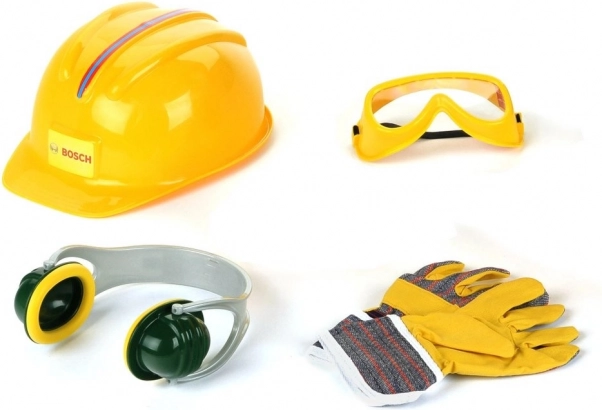 Setul include o cască galbenă cu închidere ajustabilă, protecții pentru auz în verde-galben, ochelari de protecție galbeni cu „lentile” transparente din plastic pe bandă elastică și mănuși confortabile în combinație galben-gri. Toate sunt ușoare, adaptate nevoilor copiilor și ideale ca accesorii pentru ateliere și seturi de unelte pentru copii.