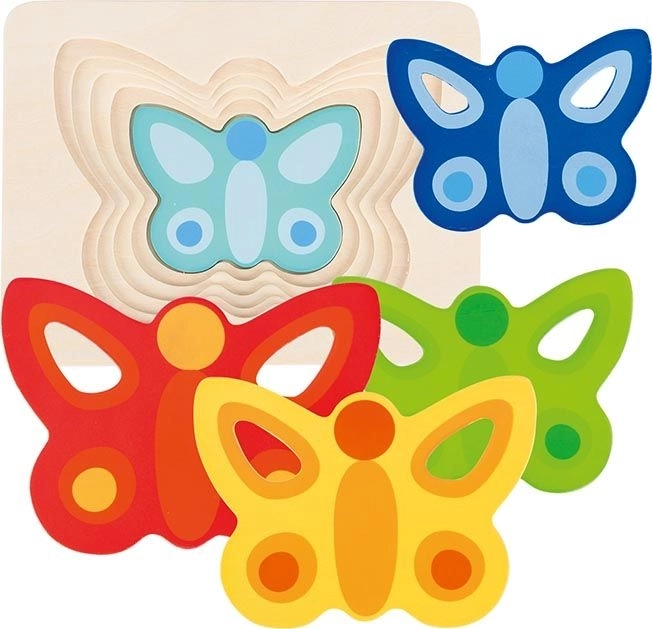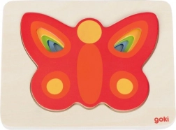 Descoperiți puzzle-ul stratificat jucăuș cu motiv de fluturi colorati de la GOKI. Copiii se vor distra asamblând și, în același timp, își vor dezvolta motricitatea fină, recunoașterea culorilor și gândirea logică. Sunt cinci piese, iar în fiecare strat se potrivește întotdeauna doar un singur fluturaș, ceea ce susține răbdarea și învățarea în pași.