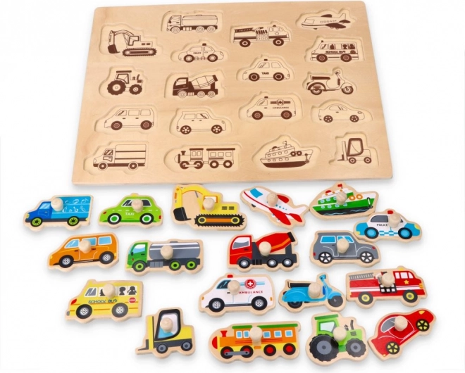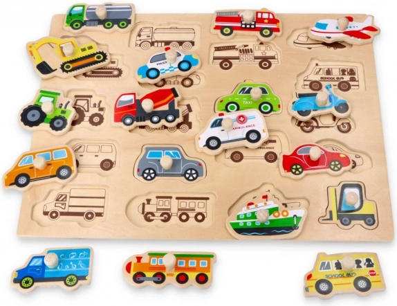 Acest puzzle de calitate, din lemn natural, oferă copiilor un joc sigur și captivant. Fiecare piesă reprezintă un vehicul diferit și are mânere tip buton practice din lemn, pentru a fi ușor de apucat cu mânuțele mici. Pe placa de bază sunt contururi imprimate care îi ajută pe copii să așeze corect piesele și îi învață să recunoască formele și culorile.