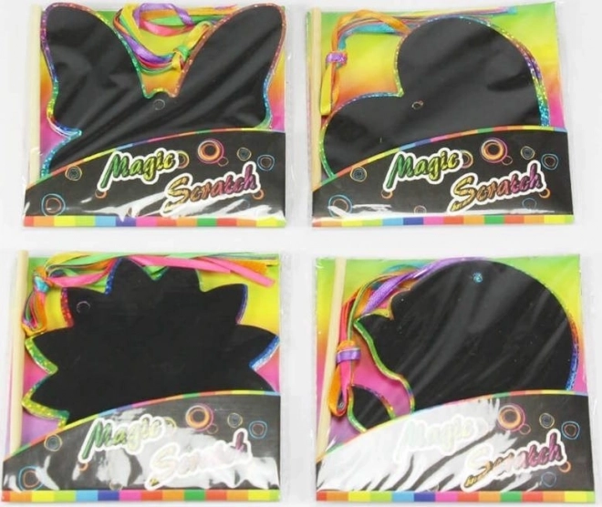 Procedeu simplu, rezultat spectaculos – răzuiți liniile pretipărite și, sub stratul negru, vor apărea culori curcubeu. Imaginile finalizate pot fi agățate imediat datorită panglicilor colorate și vor înfrumuseța camera copilului. Ideal pentru activități acasă, la școală sau la ateliere.