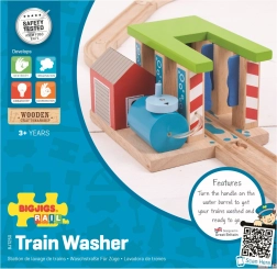 Produsul este fabricat din materiale naturale de calitate, obținute responsabil și respectă standardele europene actuale de siguranță. Datorită dimensiunilor universale, spălătoria este compatibilă cu majoritatea șinelor și trenulețelor din lemn de pe piață. Trenul nu este inclus în pachet, permițând conectarea facilă la seturile deja existente.