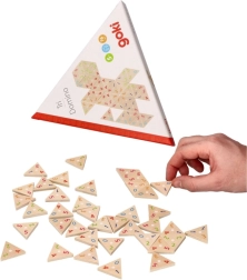 Tri-Domino de la Goki este o abordare neconvențională a unui joc clasic, care are ca scop triplarea distracției! Jucătorii trebuie să asambleze piesele triunghiulare astfel încât să se formeze un triunghi mare cu o lungime de latură de patru sau cinci ori mai mare.