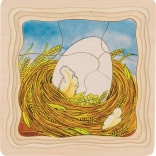 Acest puzzle deosebit din lemn este împărțit în patru straturi de imagini, fiecare reprezentând o etapă de dezvoltare a găinii. Fiecare strat are un design diferit și un număr variat de piese, oferind diversitate și stimulând imaginația copiilor. Puzzle-ul este așezat pe o placă solidă cu margini frezate, care servește drept suport stabil pentru asamblare.