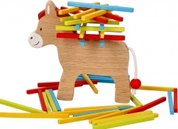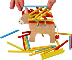 Jocul ajută la dezvoltarea abilităților de motricitate fină prin plasarea atentă a bastonașelor pe măgăruș.