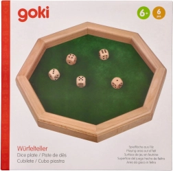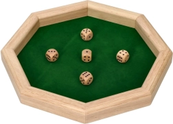 Joc de societate elegant VRHCÁBY de la GOKI pentru distracție în familie și cu prietenii. Se joacă cu 5 zaruri, se notează combinațiile, iar obiectivul este să obții cât mai multe puncte. Execuția din lemn de calitate și suprafața de joc din piele întoarsă asigură aruncări plăcut de silențioase. Dimensiuni compacte 25,7 × 25,7 cm, zaruri 1,6 cm.