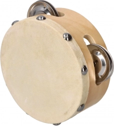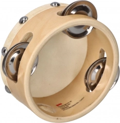 Tamburina are un aspect tradițional cu corp din lemn natural și țimbale metalice fixate ferm.