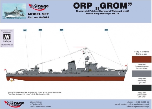Model detaliat al distrugătorului ORP 'Grom' din al Doilea Război Mondial pentru pasionații de modelism. Permite crearea unei replici exacte a cunoscutului distrugător polonez cu componente de calitate.