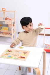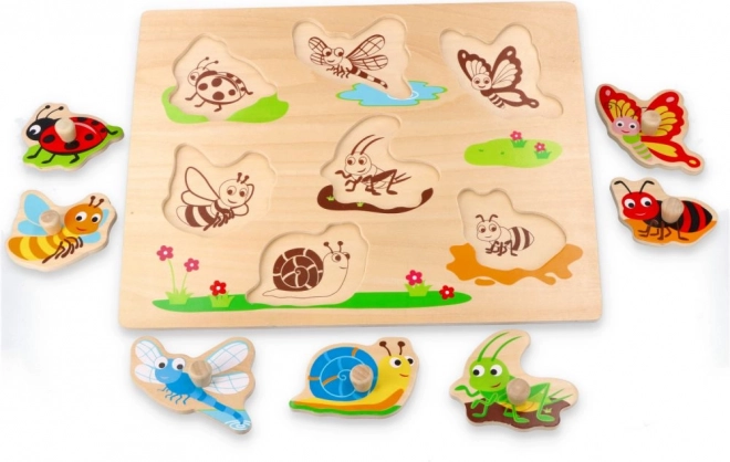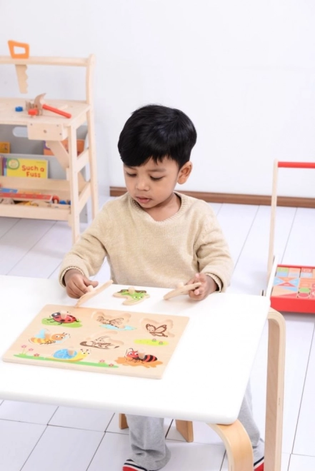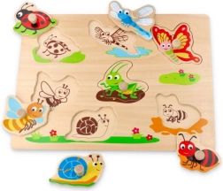 Acest puzzle din lemn cu butoni, cu tematică de insecte, este o jucărie didactică ideală pentru primele descoperiri ale formelor. Datorită mânerelor tip buton, copiii învață ușor să manipuleze piesele, dezvoltând motricitatea fină și coordonarea mână–ochi.