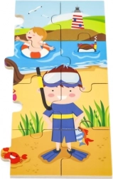 Scena colorată de pe plajă invită la asamblare și deschide ocazia de a povesti despre vară, apă și comportamentul sigur în aer liber. Copiii își extind astfel vocabularul și imaginația.