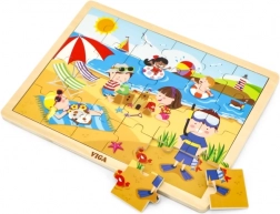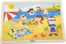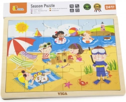 VIGA puzzle din lemn Vară – 24 de piese este primul puzzle ideal pentru copiii de la 2 ani. Piesele din lemn și rama ajută la menținerea motivului pe poziție, astfel încât copiii se pot concentra pe asamblare și pe bucuria rezultatului. Ilustrația estivală veselă de pe plajă dezvoltă în mod natural vocabularul și imaginația.
