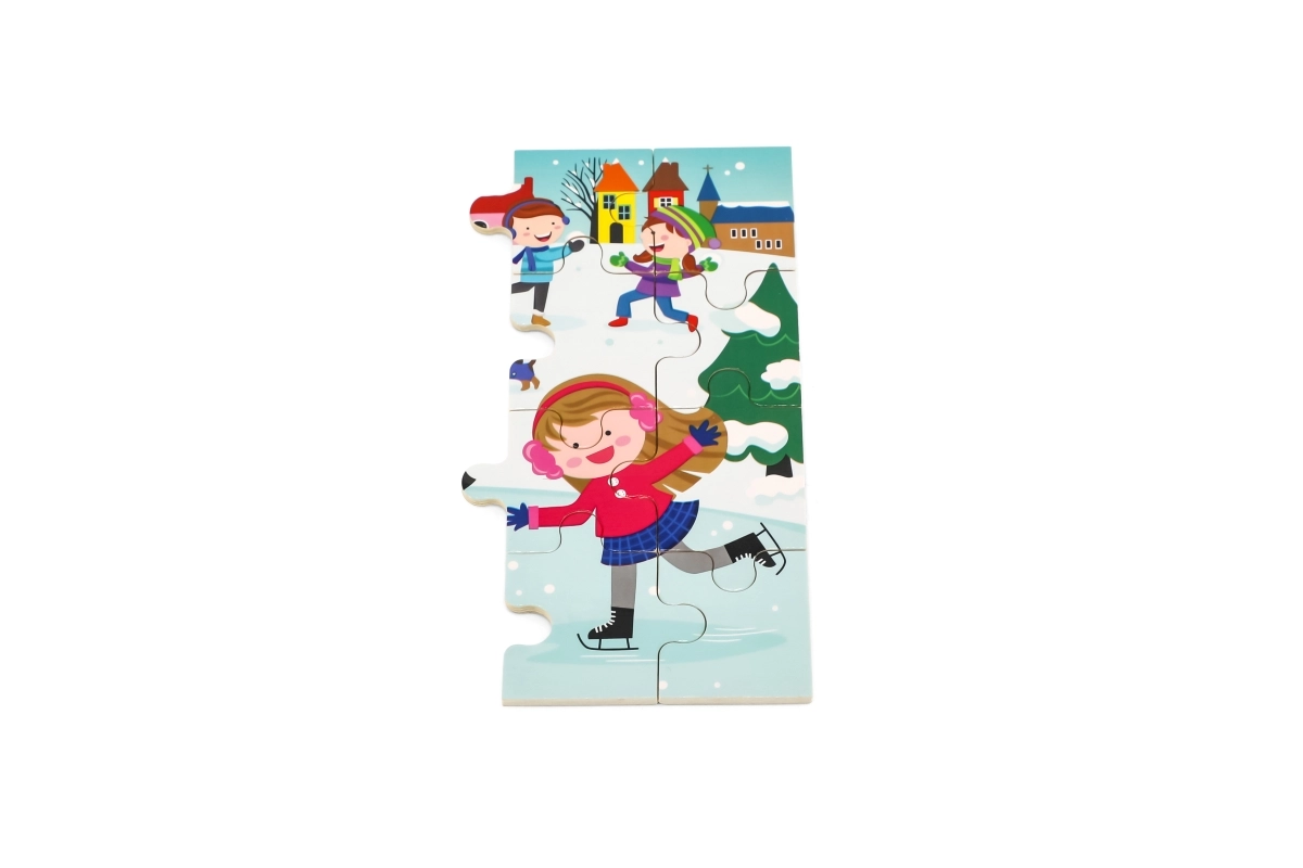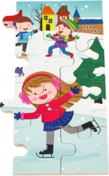 Scena de iarnă colorată, cu copii pe zăpadă, motivează la asamblare și dezvoltă percepția culorilor, detaliilor și situațiilor.